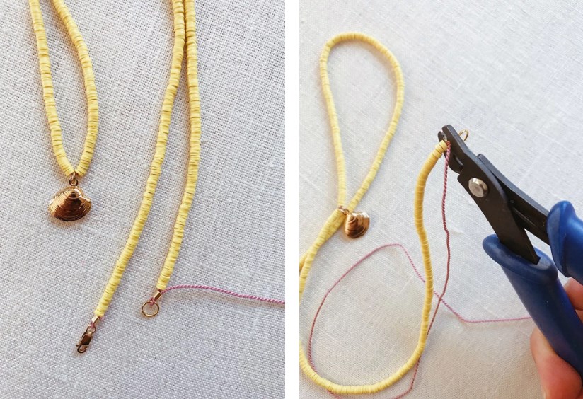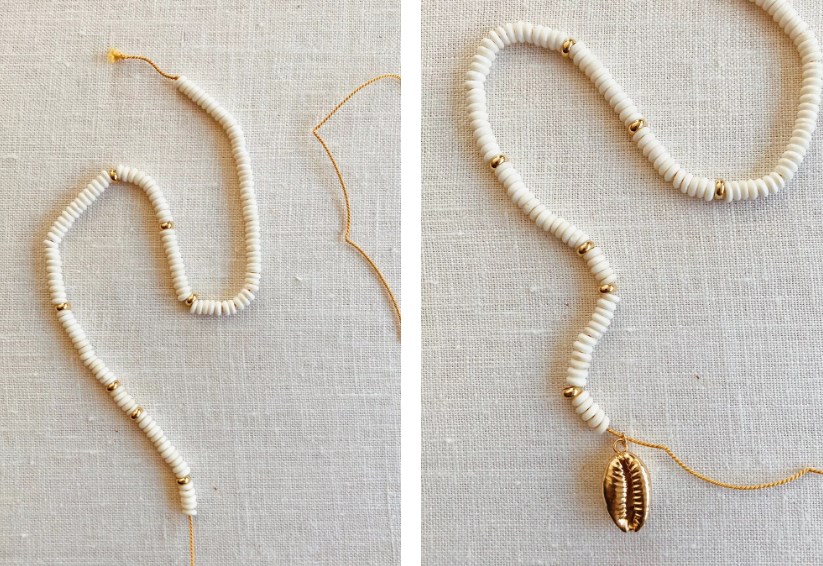 2. На середине нужной длины будущего ожерелья добавьте следующую свою очаровательную раковину.