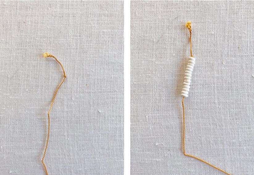 1. Для более длинных ожерелий вам не понадобится застежка, так как они могут легко одеваться через голову и скользить по вашей шее. Чтобы начать более длинное ожерелье, завяжите двойной узел на конце нити для бисера и начните нанизывать на нее бисер.