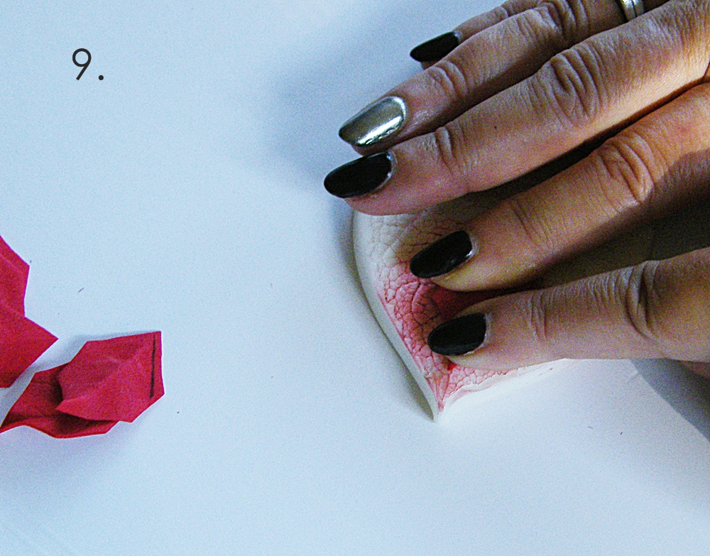 9. Используйте молд в форме листа, чтобы придать текстуру своему листику из фома. Для того, чтобы получить хорошую текстуру, приложите сначала лист на утюг на несколько секунд, затем поместите его на молд и прижмите.