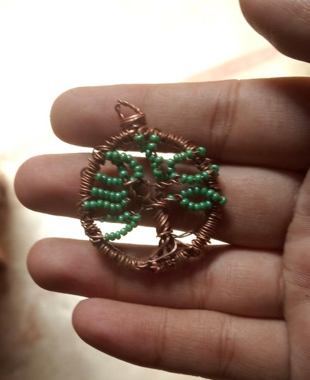 Возьмите большую вашу зеленую бусинку и проденьте через нее кусок толстой проволоки длиной около 15 см. Оплетите ею бусину (оберните несколько раз). Концы проволоки скрутите в жгут, из которого затем сформируйте кольцо диаметром около 1 см (или другого размера – на ваше усмотрение). Один из проволочных концов получившейся подвески прочно оберните вокруг каркаса дерева на том участке кольца, где располагаются корни вашего дерева - как изображено на фото. Обрежьте лишние концы проволоки и убедитесь, что не осталось торчащих заостренных проводов – их нужно тщательно подогнуть внутрь изделия. Теперь ваш кулон готов! Прикрепите его за верхнюю петельку к ленте, цепочке, шнуру или другой основе. Пусть он приносит вам радость и успех!