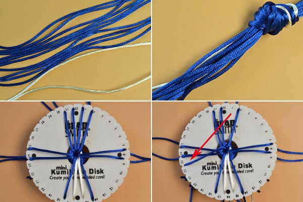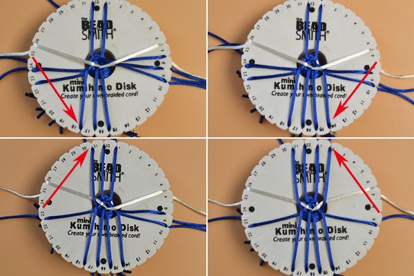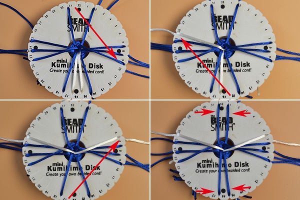 Расположите шнуры на диске для плетения кумихимо, как показано на схеме