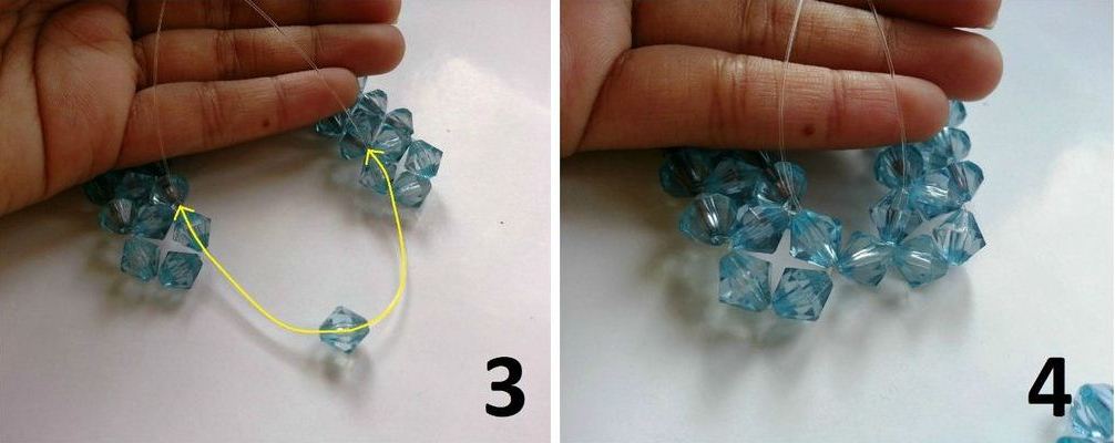 3. Возьмите 4-ю бусинку и протяните оба конца нитки через нее с противоположных сторон (навстречу друг другу).