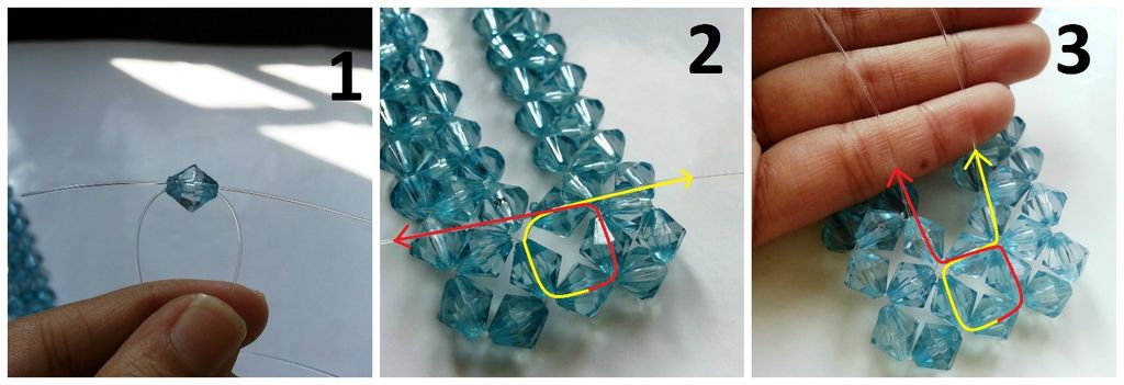9. Положите две цепочки из кристаллических бусинок рядом и вставьте один конец нити в первую боковую бусину одной из этих двух цепочек, удерживая новую нанизанную бусинку по центру рабочей нити. На фото 2 разных конца нити окрашены в разные цвета - желтый и красный, соответственно для каждого конца.