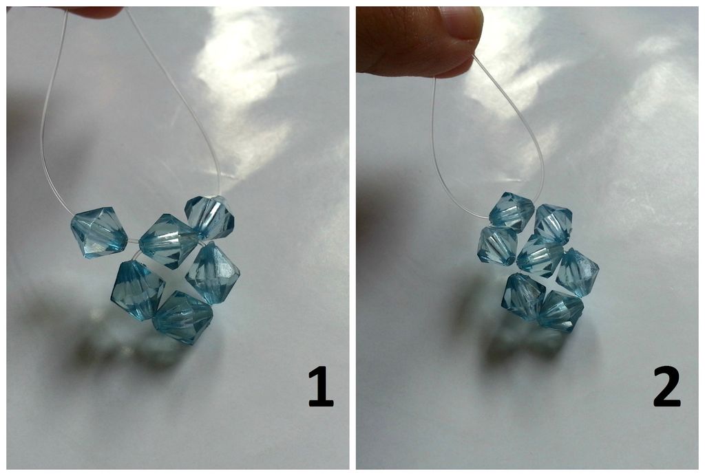 2. Нанижите 3 биконических бусинки на нить и установите их по центру нити.
