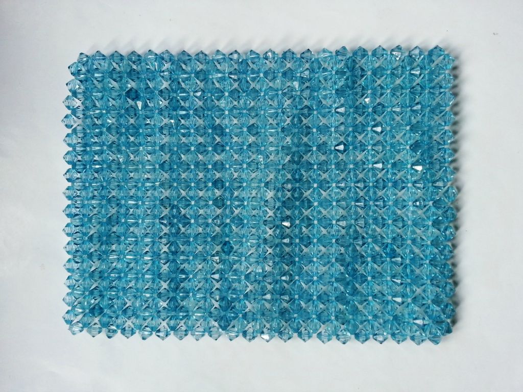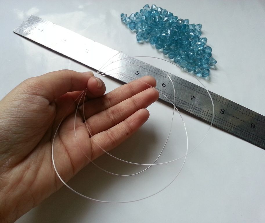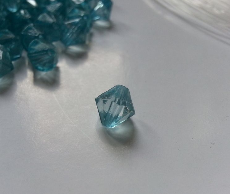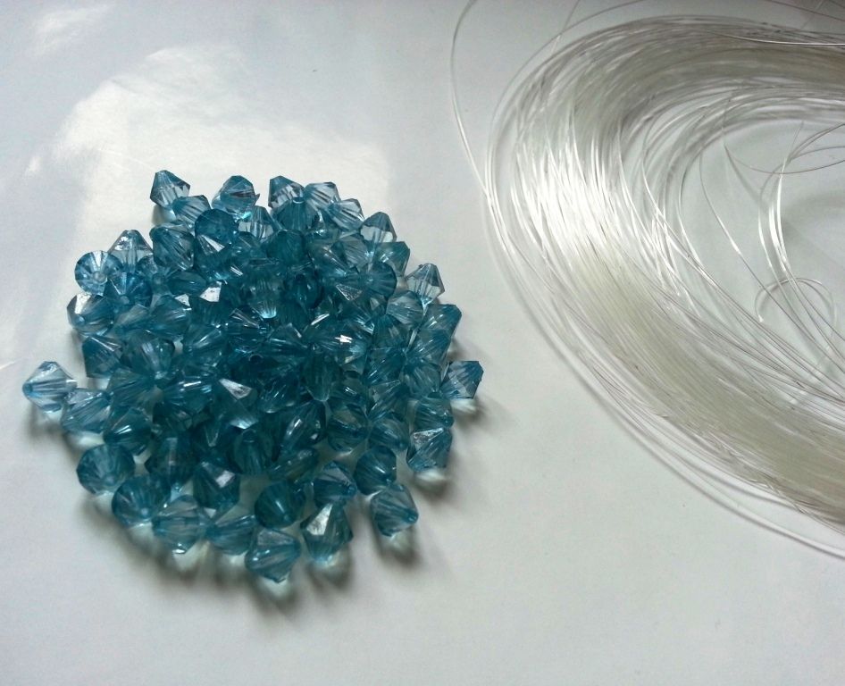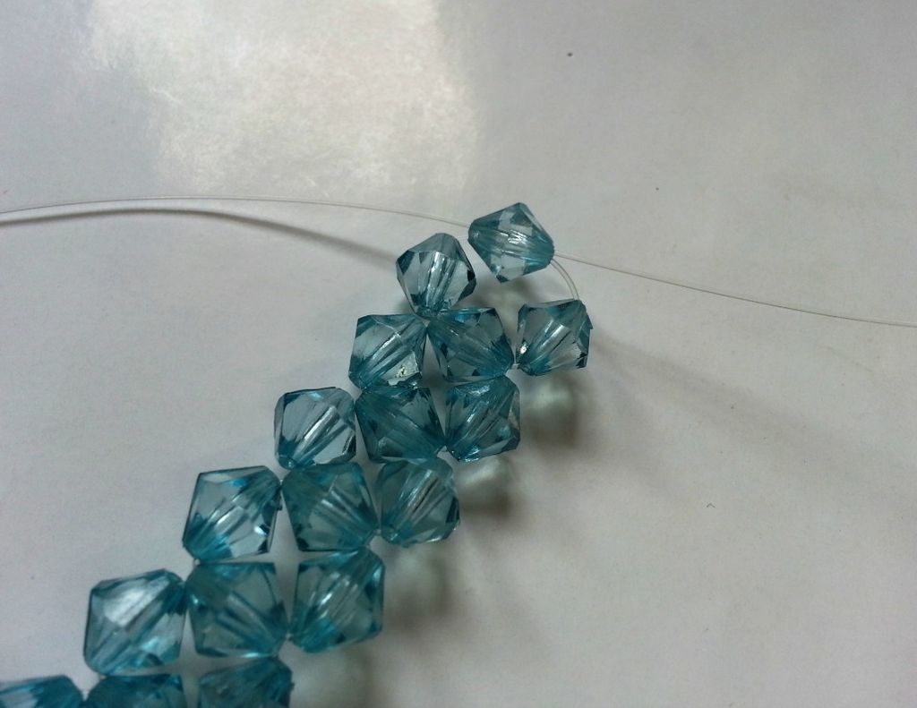8. Соединение хрустальных цепочек между собой в единое полотно. Возьмите отрезок пластиковой мононити в 3 раза длиннее высоты кошелька и нанижите на нее биконическую бусинку, поместив ее по центр нити.