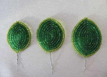 1. Создаем заготовки-листики. Наденьте 5 зеленых бисерных шарика на проволоку, после чего скрутите оба ее конца так, чтобы один оставался свободным.