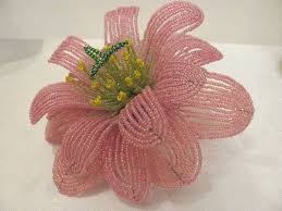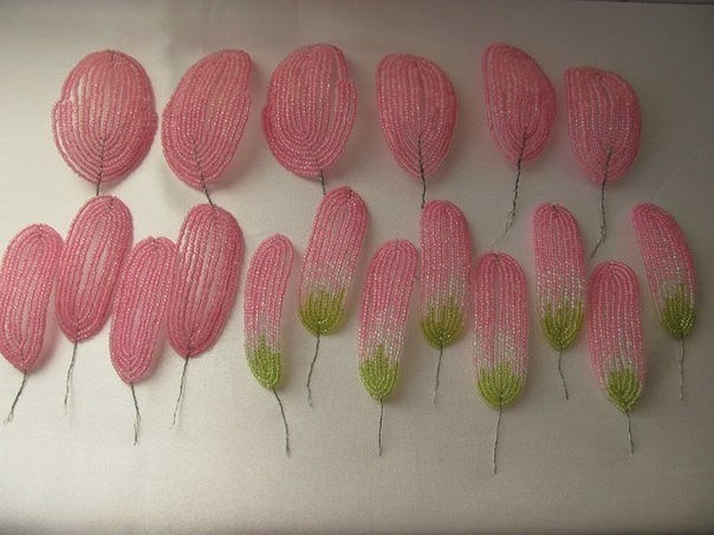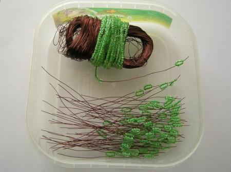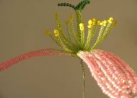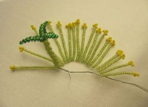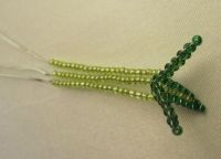 Когда тычинки будут готовы, большие вставьте в салатовую бусину овальной формы. Собираются они следующим образом: к большим тычинкам прикрепите проволоку диаметром 2 мм, затем вокруг них равномерно установите тычинки, после них - небольшие лепестки, следом - средние и последними - самые крупные. Потом туго обмотайте зелеными нитками получившийся стебелек и закрепите обмотку клеем.