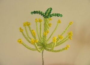 Отрежьте 35 см проволоки и нанижите на нее бисерины в таком порядке: 5 штук салатовых, затем светло-желтые, после них белые матовые, и последней - одна золотая. Потом пройдите проволокой через все бисеринки, кроме золотистой.