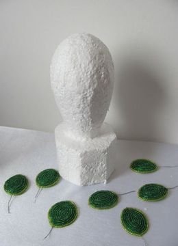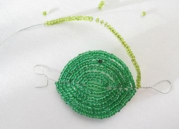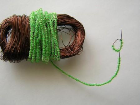 1. Нанижите на проволоку побольше зеленого бисера. Отделите 8 бисеринок и, минуя первые 4, проденьте проволоку в следующие 4 из этих 8-ми. Оставьте торчащим конец проволоки длиной около 1,5 см, а на другом краю от образовавшейся петельки оставьте кончик длиной 4 см, отрезав остальную проволоку. Сформируйте из петельки овал.