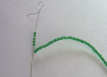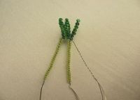 2. Затем нанижите на него еще 8 зеленых бисеринок и закрутите проволоку над первой бисериной, надетой в предыдущей строчке.