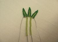 5. В каждом следующем ряду добавляйте по несколько бисерин, пока не сформируете листик. Чтобы получить лист нужной формы и размера, следует набрать 13 рядов зеленым 2 ряда светло-зеленым бисером.