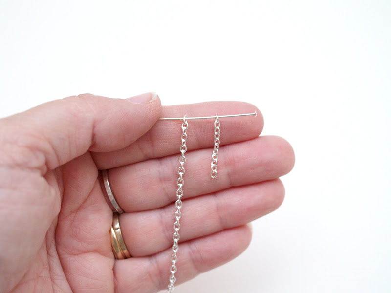 2. Отрежьте от цепочки 2 кусочка одинаковой длины. Используйте пин, чтобы точно отмерить длину: оденьте на пин уже отрезанный кусочек цепочки и рядом оденьте основную цепочку – так будет виднее, сколько звеньев вам нужно взять.