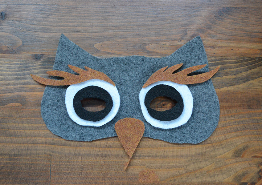 Шаг первый: распечатайте или нарисуйте от руки на листе бумаги шаблон своей маски (такой, как на фото) и вырежьте его. Вам нужно будет вырезать две заготовки из серого фетра. Нарисуйте эскизы клюва, бровей и кругов, которые будут вокруг глаз совы, а затем вырежьте эти элементы, чтобы использовать как выкройки.