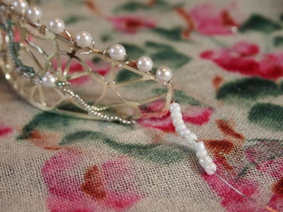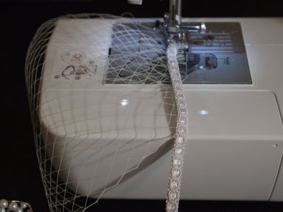 Мы сделали отдельную маленькую вуаль, которую можно перемещать по своему усмотрению – можно носить прикрепленной к ободку и снимать ее, когда захочется. Для этого вырежьте маленький кусочек сетки и примерьте его к своему головному убору с бисером. Потом, сделайте большую складку, сложив немного материала внутрь и пришив его швейной машиной. Затем, сделайте еще одну складку и снова прошейте ее, прежде чем обрезать излишки. Обрезав их, возьмите маленький кусочек декоративной ленты и пришейте его прямо на маленькую вуаль - чтобы скрыть швы и придать ей законченный вид.