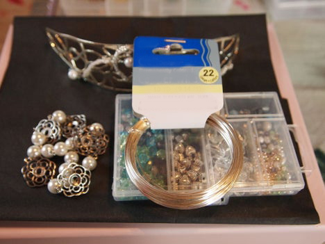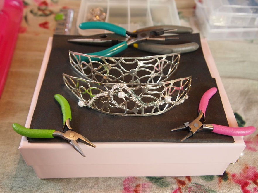 Вам понадобится довольно много материалов, чтобы сделать этот свадебный обруч на голову. В качестве основы для него мы взяли серебряный браслет-манжету и изменили его форму, согнув ее так, чтобы она в точности повторяла изгиб левой стороны головы.