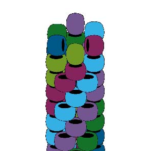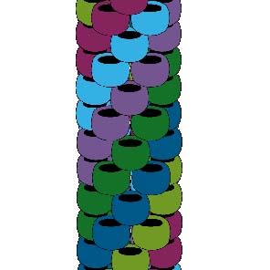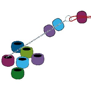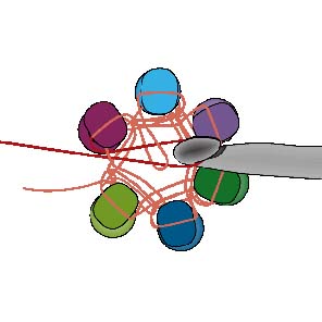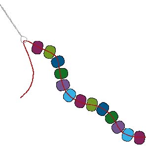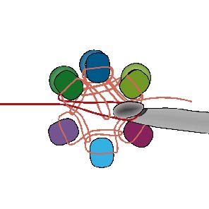 2. Чтобы упростить иллюстрации к технике, мы покажем нитку с шестью бусинами, каждую бусину показывая разным цветом. Размещайте их в последовательности, необходимой для вашего рисунка. Имейте в виду, что в готовом жгуте бусинки будут располагаться одна над другой и слегка смещенной в сторону.