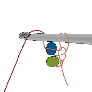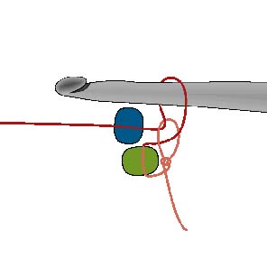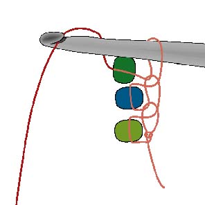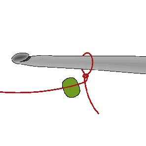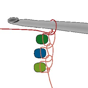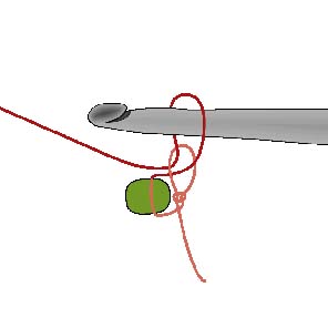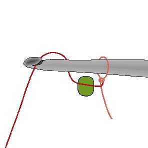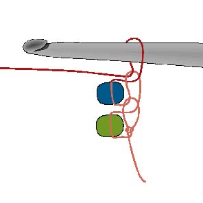 10. Зацепите пряжу крючком и протяните ее через петлю. Так мы завершили второе звено цепочки с бисером.