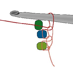 26. Переместите предварительно нанизанную бусину (зеленую) в такое положение, чтобы она находилась над бусинкой того же цвета в предыдущем ряду, расположенной справа от крюка. Переведите пряжу поверх него.