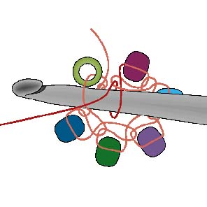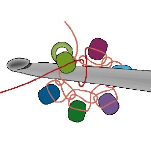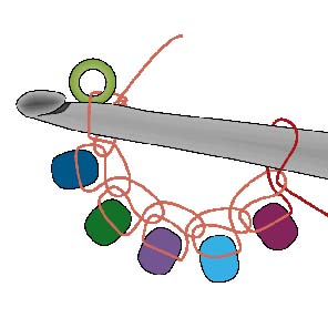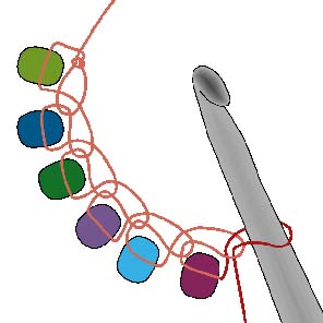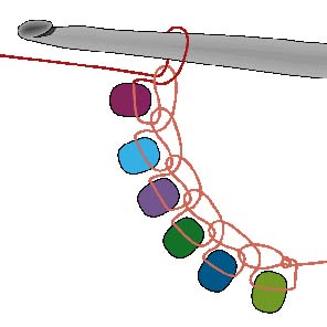 13. Зацепите пряжу крюком и протяните ее через петлю, завершая еще одно звено цепочки с бусинками.