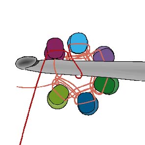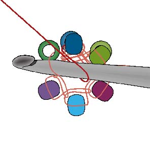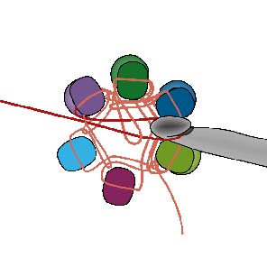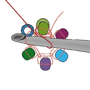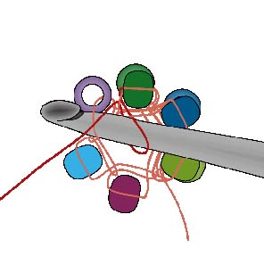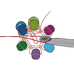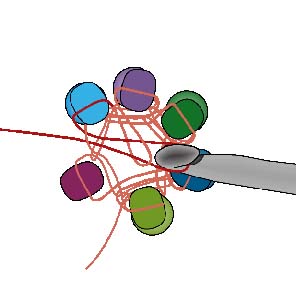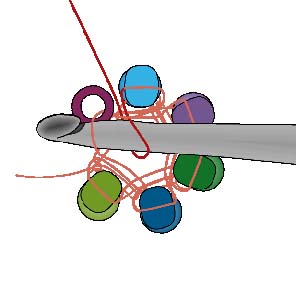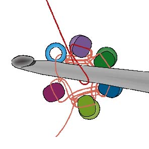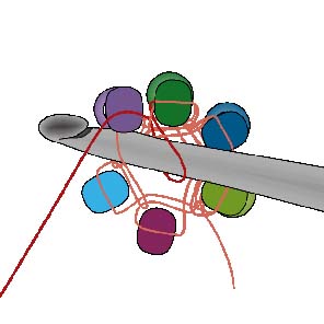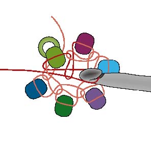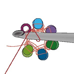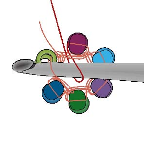 37. Подведите рабочую нить между пятой (бирюзовой) и шестой (фуксия) бусинами первого круга и над петлей на крючке.