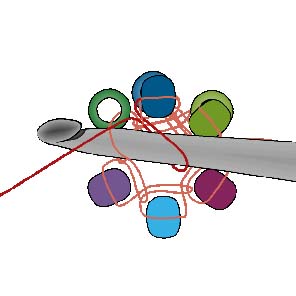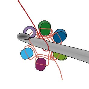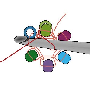 33. Проведите рабочую нить между четвертой (лавандовой) и пятой (бирюзовой) бусинами первого круга и над петлей на крючке.