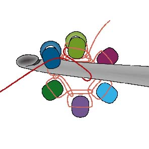 25. Подведите рабочую нить между второй (синей) и третьей (темно-зеленой) бусинкой первого круга и над петлей на крюке.