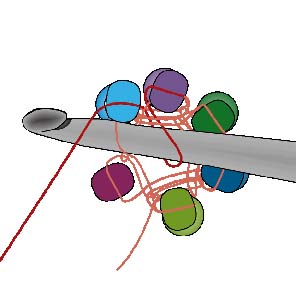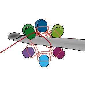 17. Соедините цепь в кольцо. Приложите рабочую нить к бусинке, под которую вы только что продели крючочек, так, чтобы она находилась между первой (цвет перидота) и последней (цвет фуксиии) бусинами первого круга (см. рис.). Пряжу пропустите поверх крюка.