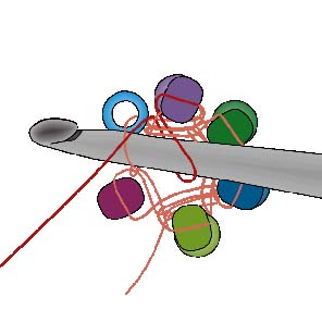 36. Проденьте крюк через следующую петлю цепи под следующей бусинкой (фуксия). Это последняя из шести бисерин первого ряда. Поверните первую бисеринку справа от крючка так, чтобы ее отверстие проходило параллельно крюку.