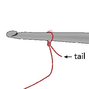 3. После того, как закончите нанизывать бисер, НЕ обрезайте нить. Мы будем продолжать использовать нить из катушки, когда будем вязать крючком. Снимите витую проволочную иглу. Оставьте 20-30 сантиметровый хвост и сделайте скользящий узел. На наших рисунках хвост показан намного короче, чем на самом деле, чтобы упростить изображения.