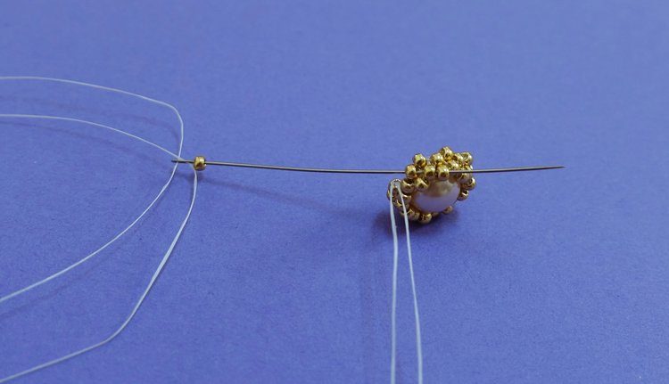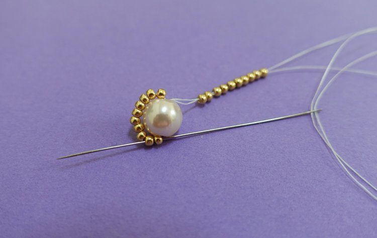 2. Наденьте жемчужину, затем достаточное количество бисера 11-го размера, чтобы обернуть жемчужину примерно наполовину ее окружности. Будьте осторожны, чтобы они не соскользнули с конца нити. Вам понадобится только пара попыток, чтобы выяснить правильное количество бисеринок. Используйте одно и то же их число с обеих сторон жемчужины, чтобы убедиться, что в итоге вы получите четное количество бисера.