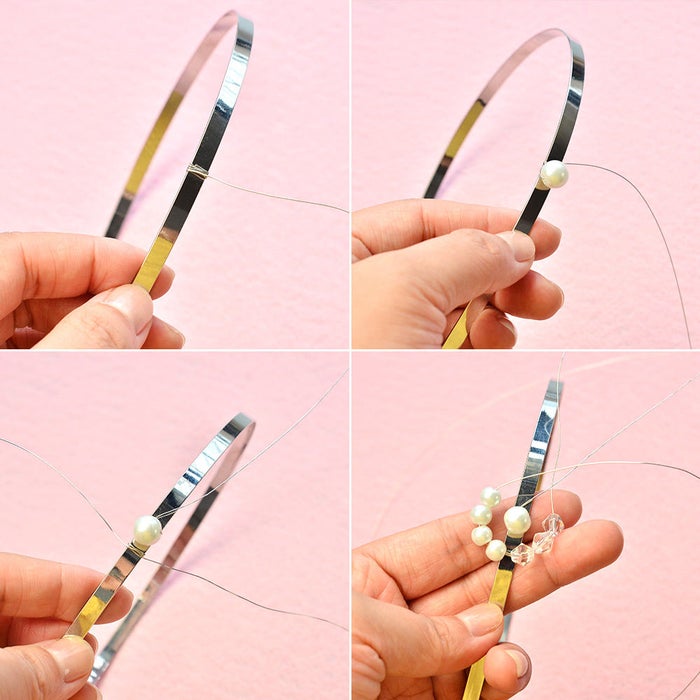 1. Отрежьте около 1 метра ювелирной проволоки. Один ее конец плотно оберните ее вокруг обруча для волос, как показано на картинке, затем нанижите круглую жемчужную бусинку на проволоку;