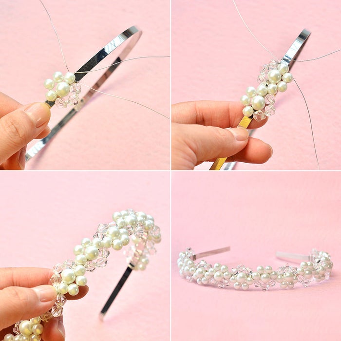 Далее продолжайте нанизывать по четыре 6-миллиметровых белых жемчужных шарика и по три хрустальных бусины на два конца того же куска проволоки, на который нанизали бусины в предыдущем шаге. После каждого цикла нанизанных бусинок, перекручивайте друг с другом концы проволоки, обматывайте вокруг ободка и плотно их затягивайте;