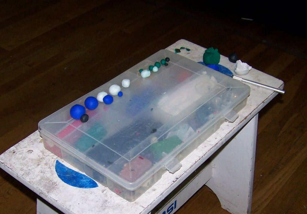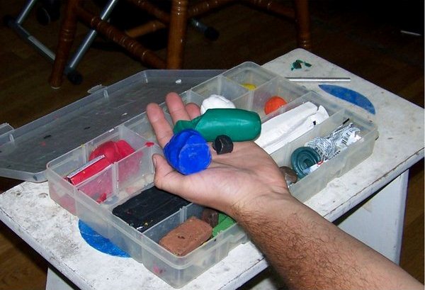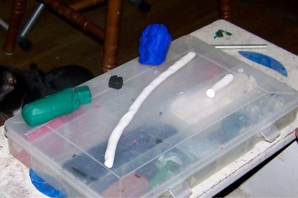 Чтобы соединить два цвета в третий, нужно сформировать из глины «колбаски», завернуть их в «рулетик», а затем раздавить в шар. Повторите несколько раз эти действия, пока цвета не смешаются в равномерный тон.