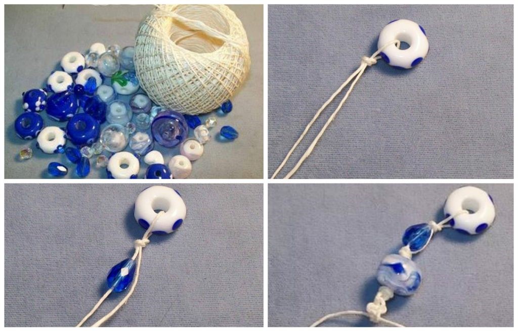 1. Для начала возьмите самую большую бусину, проденьте сквозь ее отверстие шнурок, завяжите на нем узел «галстук». После этого на один из концов шнура нанижите бусину и завяжите под ней еще два таких же узелка (см. фото).