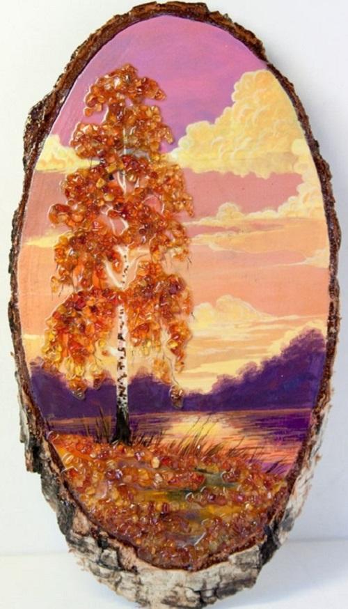 Для этой цели берется янтарная крошка, а для основы хорошо подойдет срез дерева. Когда найдете подходящий эскиз, нужно на основу нанести рисунок красками, а потом просто обклеить камешками.