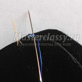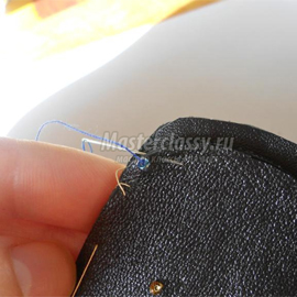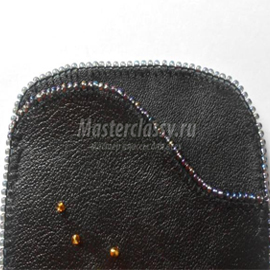 18. Обшиваем край чехла. Иголка выводится снизу вверх, нанизывается одна бисеринка. Затем снова игла выходит снизу вверх, протягивается из-под нитки справа от бисерины. Таким способом изделие обшивается по всему периметру, до конца ряда. Нить на этом этапе лучше подбирать под цвет кожи (на снимке изображена синяя нить - только для лучшей наглядности).