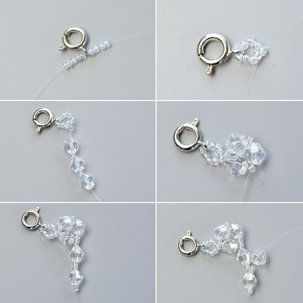 5. Добавьте на нить 2-миллиметровую белую круглую бусину и 6-миллиметровую прозрачную биконическую стеклянную бусину. Повторите этот шаг дважды (как показано на рисунке).