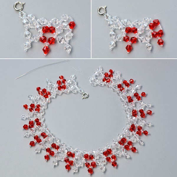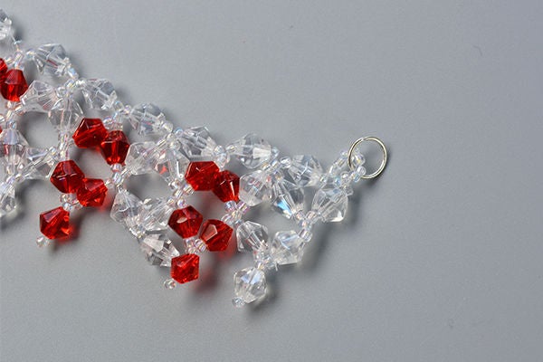 10. Вернитесь нитью через бисерину, а затем добавьте новую бисерину, за ней - прозрачную биконическую стеклянную бусинку 6 мм, 3 белых бисерины, стеклянную бусинку красного цвета диаметром 6 мм и белую бисерину (в той последовательности, которая отражена на фото).